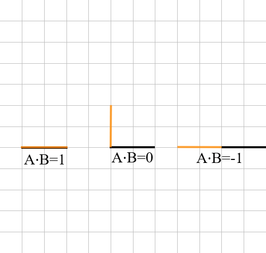 Здесь мы можем увидеть, что если если скалярное произведение положительно, то угол между векторами меньше 90 градусов. Если скалярное произведение равно нулю, векторы перпендикулярны (расположены под прямым углом друг к другу). Если скалярное произведение отрицательно, то угол между векторами больше 90 градусов.