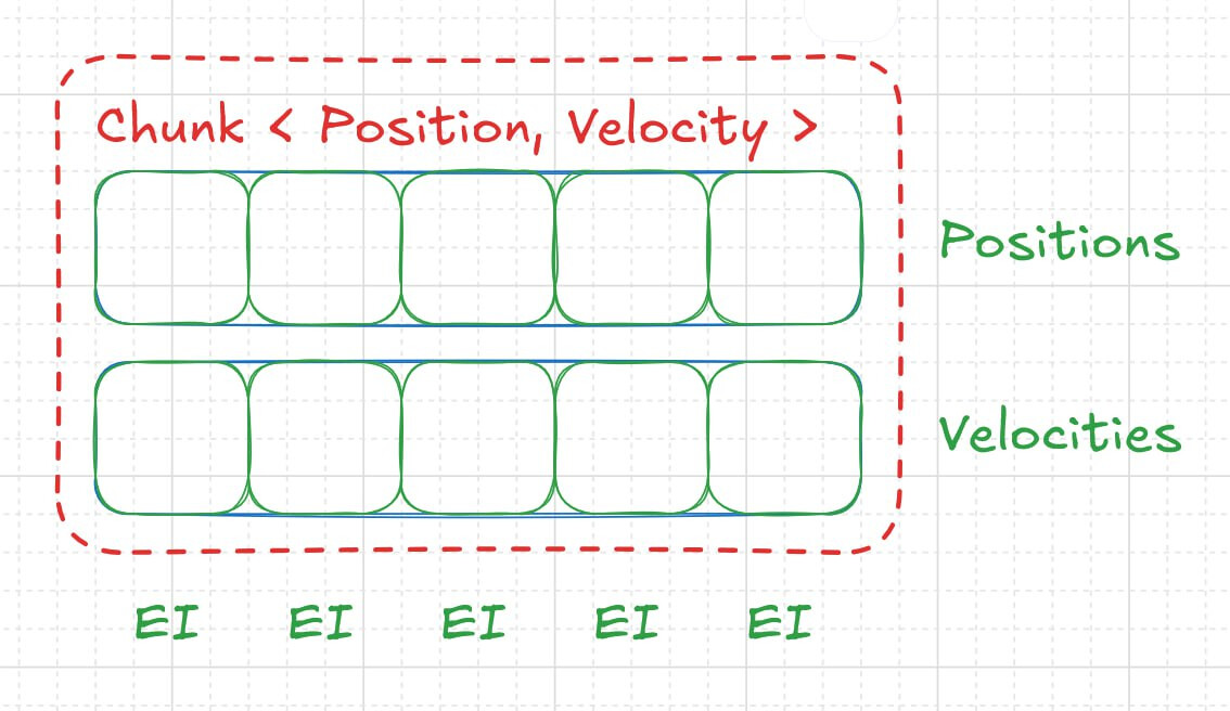 Чанк — это таблица, которая хранит вместе список сущностей и массивы компонентов для фиксированного набора фрагментов.