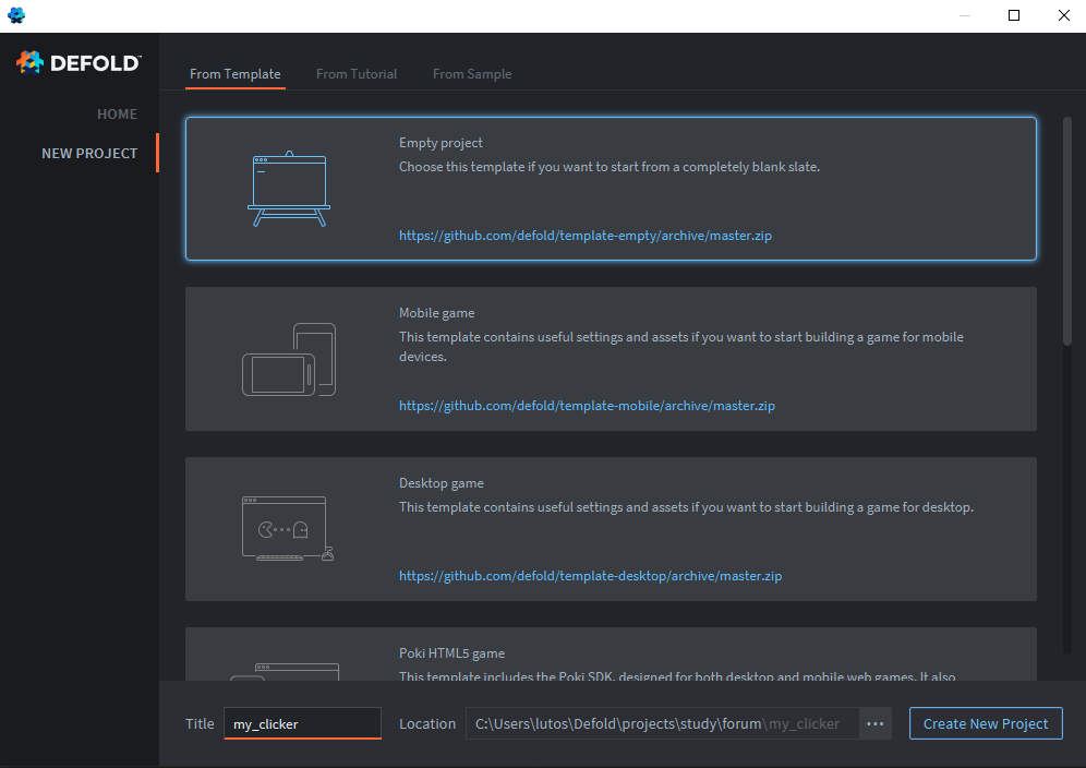 Откроем Defold и создадим пустой проект: