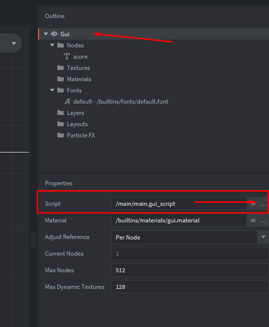 Открываем main.gui и кликаем по Gui, привязываем скрипт main.gui_script к этому gui в поле Script: