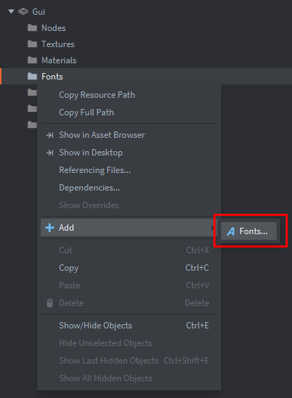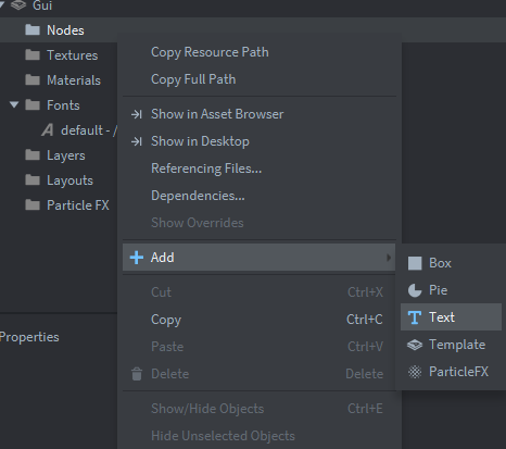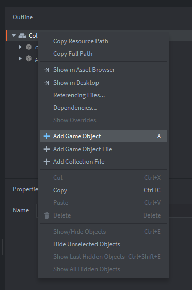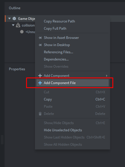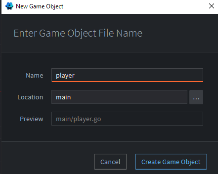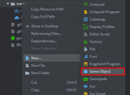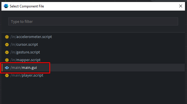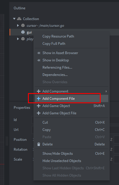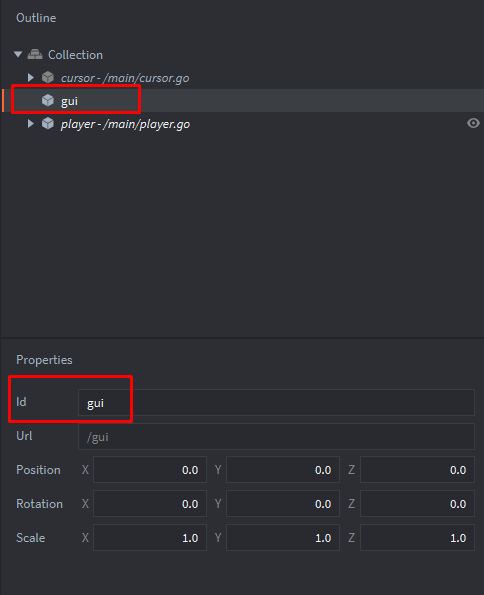 main.collection и создадим игровой объект gui:Добавим компонент файл: