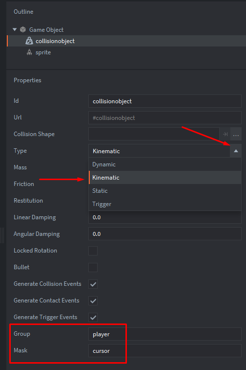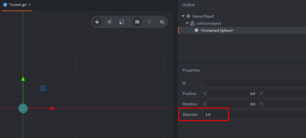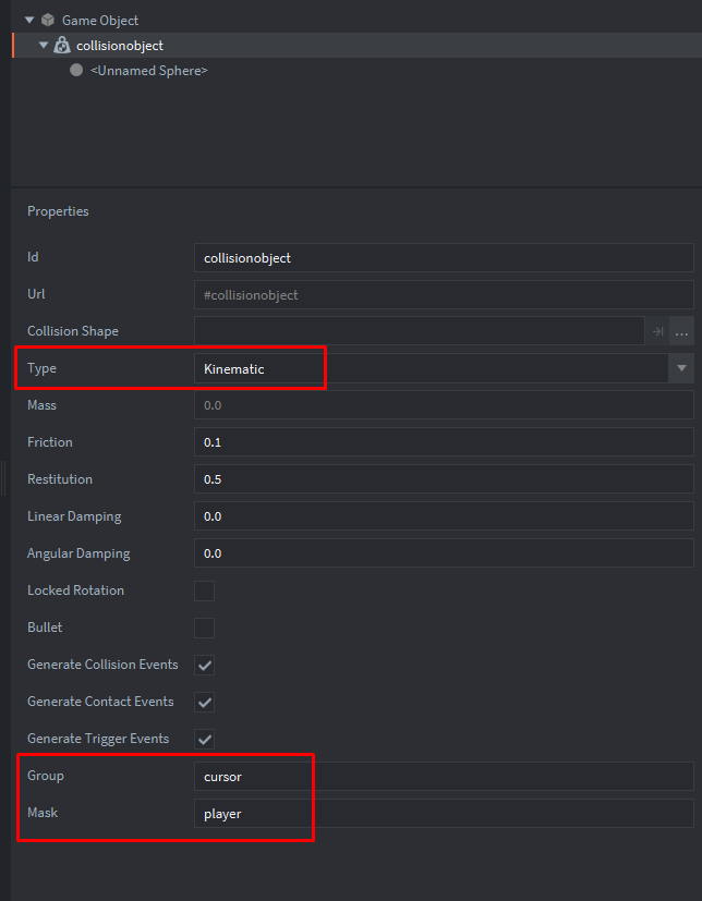 Kinematic(что значит, что столкновения будут подчиняться логике соответствующего ему скрипта). Объект столкновения будет принадлежать группе cursor и будет взаимодействовать с player:Создадим форму столкновения и изменим диаметр сферы:
