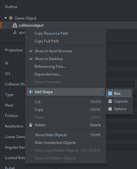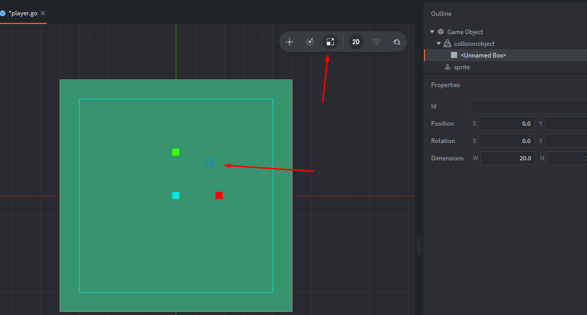 Выберем форму для объекта столкновения(у меня это квадрат):