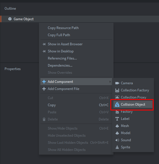 Теперь создадим компонент объект столкновения. Он нам нужен будет, чтобы отслеживать столкновения с курсором(и его объектом столкновения).