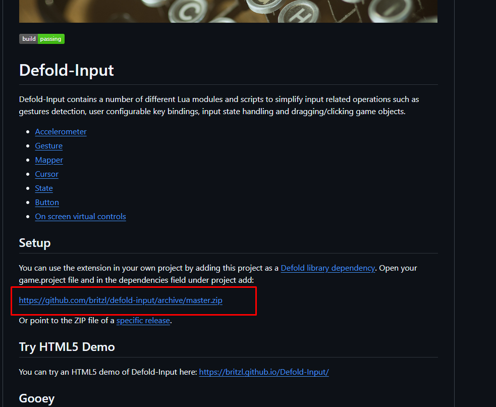 Перейдём на гитхаб репозитория библиотеки Defold Input: