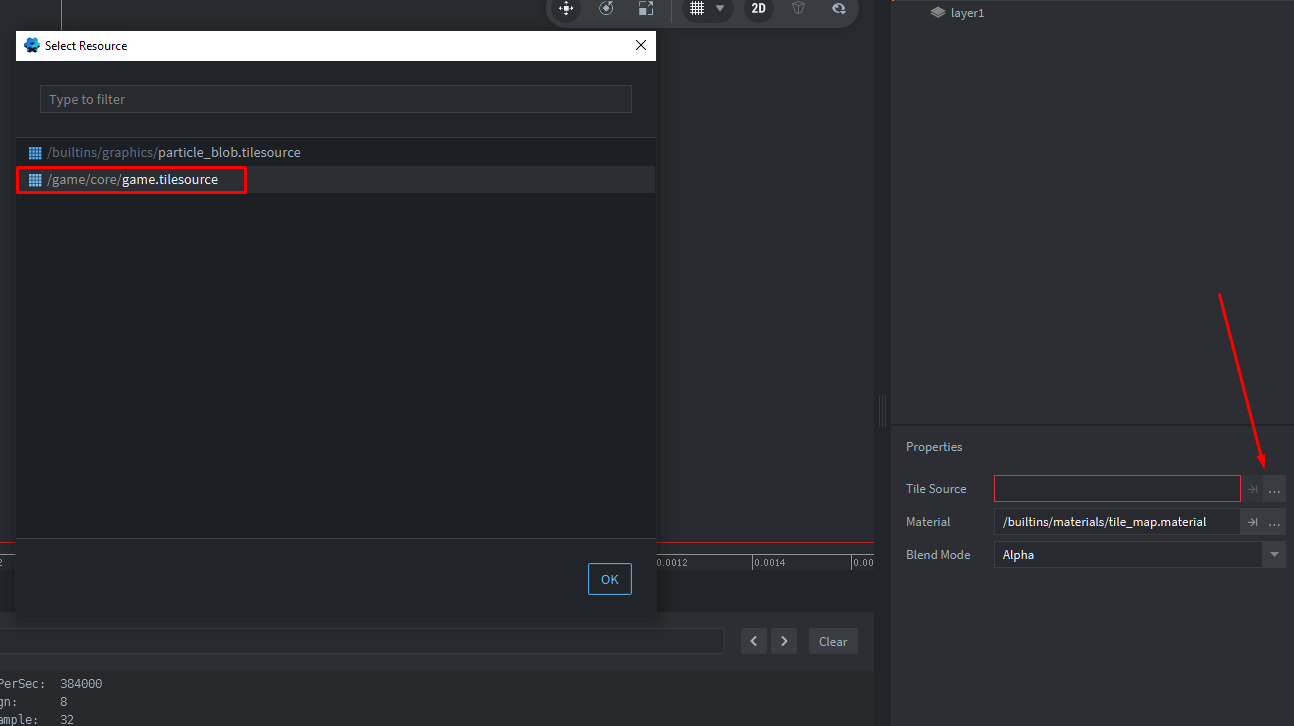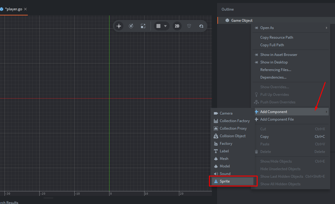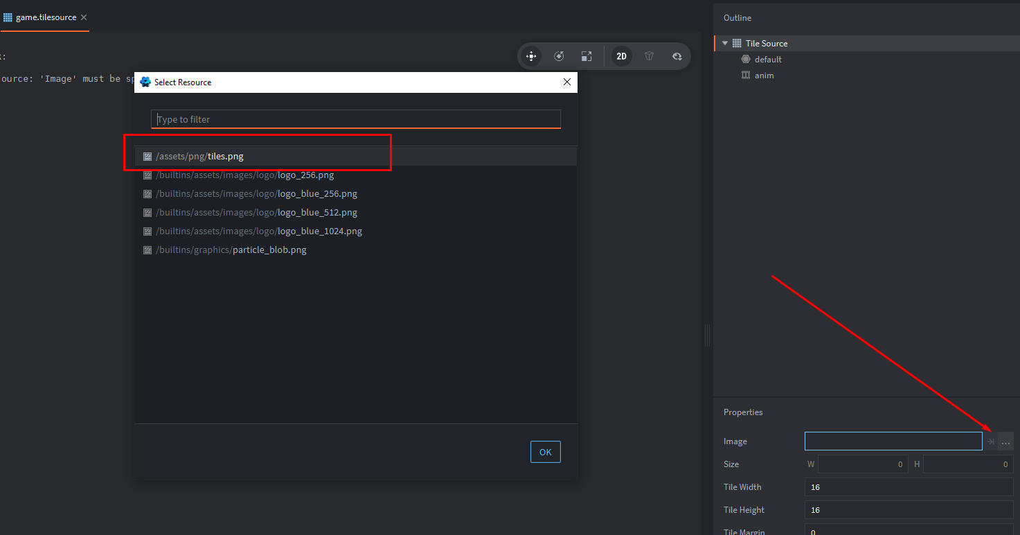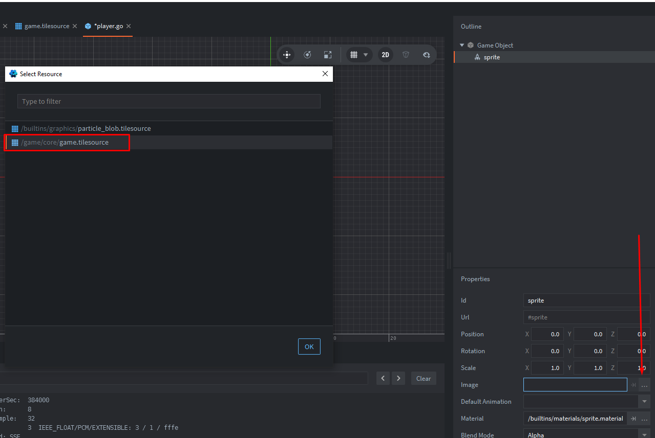 player создадим компонент sprite:Для спрайта выберем изображение, ссылаясь на наш тайловый источник: