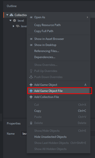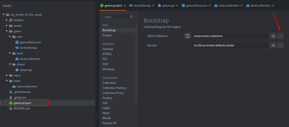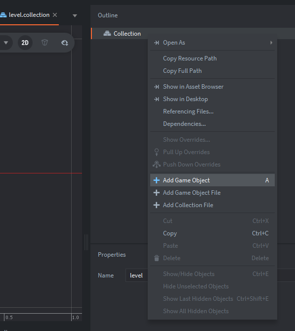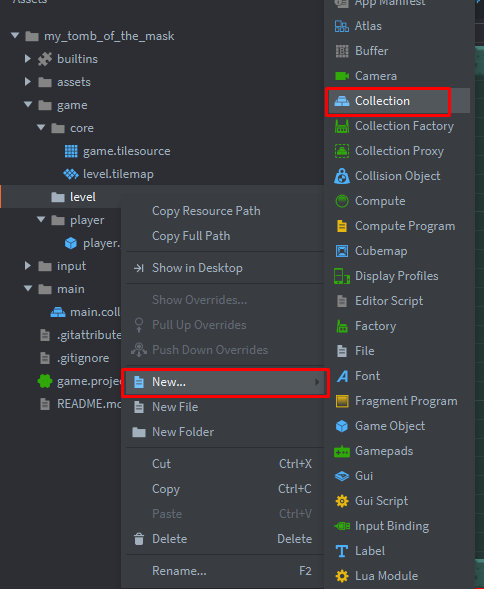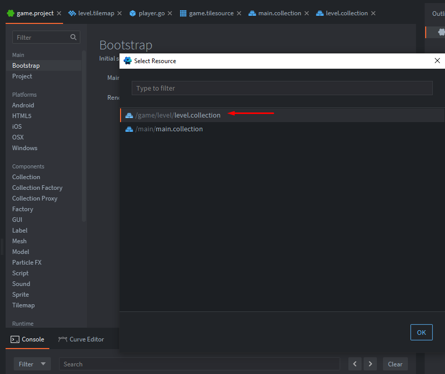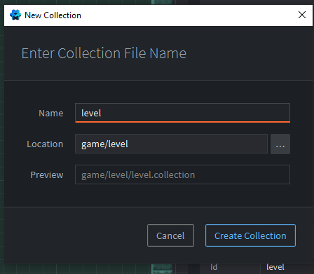 level.collection не является нашей стартовой коллекцией. Поэтому она и не загружается при запуске игры.Исправим это, укажем в качестве загрузочной коллекции нашу