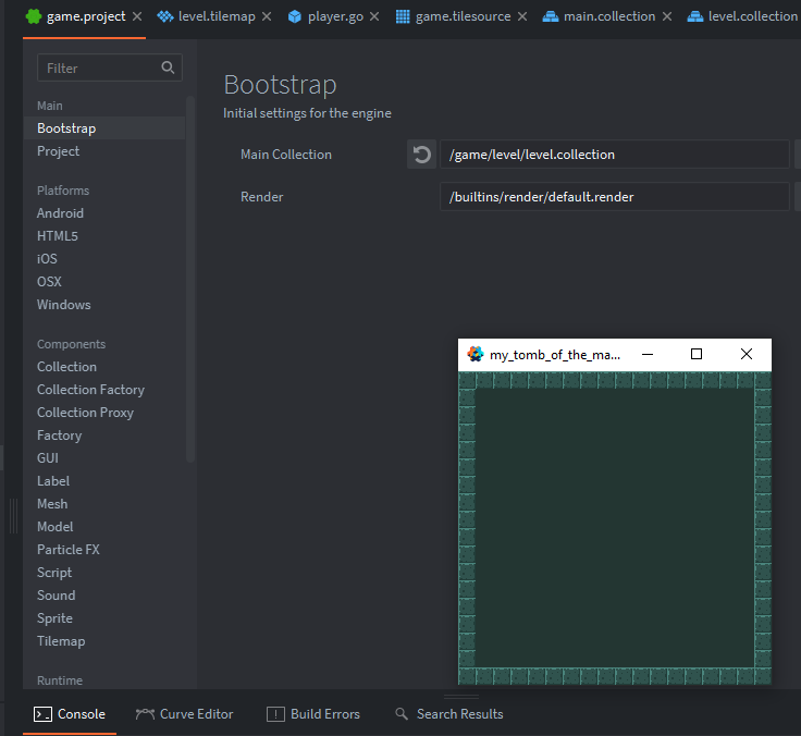 Я взял тайловые ассеты с проекта от britzl: publicexamples/examples/tilemap_layers at master · britzl/publicexamples · GitHub