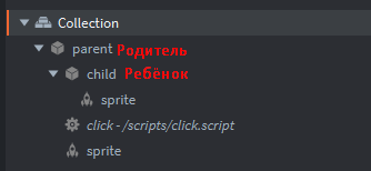 Игровой объект, который содержит в себе игровой объект, является родителем по отношению к содержащемуся в нём игровому объекту: