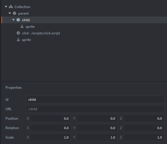 Мы видим, что в консоли показываются локальные координаты для ребёнка. И они отличаются от предыдущего случая с go.get_world_position().